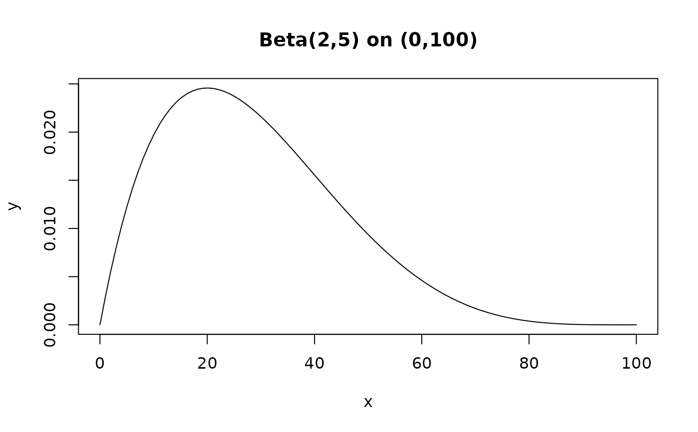 y <- dbeta_box(x, shape1 = 2, shape2 = 5, a = 0, b = 100)